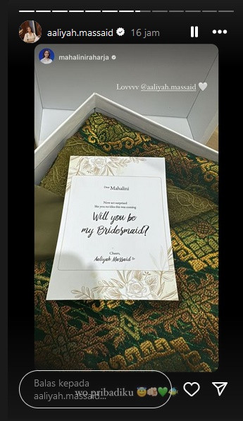 Melalui unggahan di akun Instagram story Aaliyah, terlihat sejumlah rekannya, mulai dari Mahalini, Azizah Salsha hingga Alyssa Daguise, ditunjuk olehnya untuk menjadi bridesmaid. Para sahabat dari Aaliyah ini terlihat memamerkan bungkusan yang nampaknya akan menjadi seragam saat hari bahagianya.