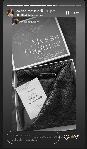 "It would be an honor to be your bridesmaid @aaliyah.massaid. Can't wait to witness the happiest day of your life!," kata Alyssa Daguise.