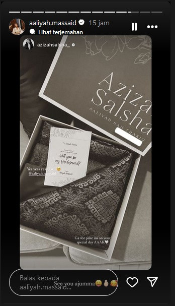 "Yes yess yess i will @aaliyah.massaid. Gak sabar pake ini on your special day AAAK," timpal Azizah Salsha. (ND)