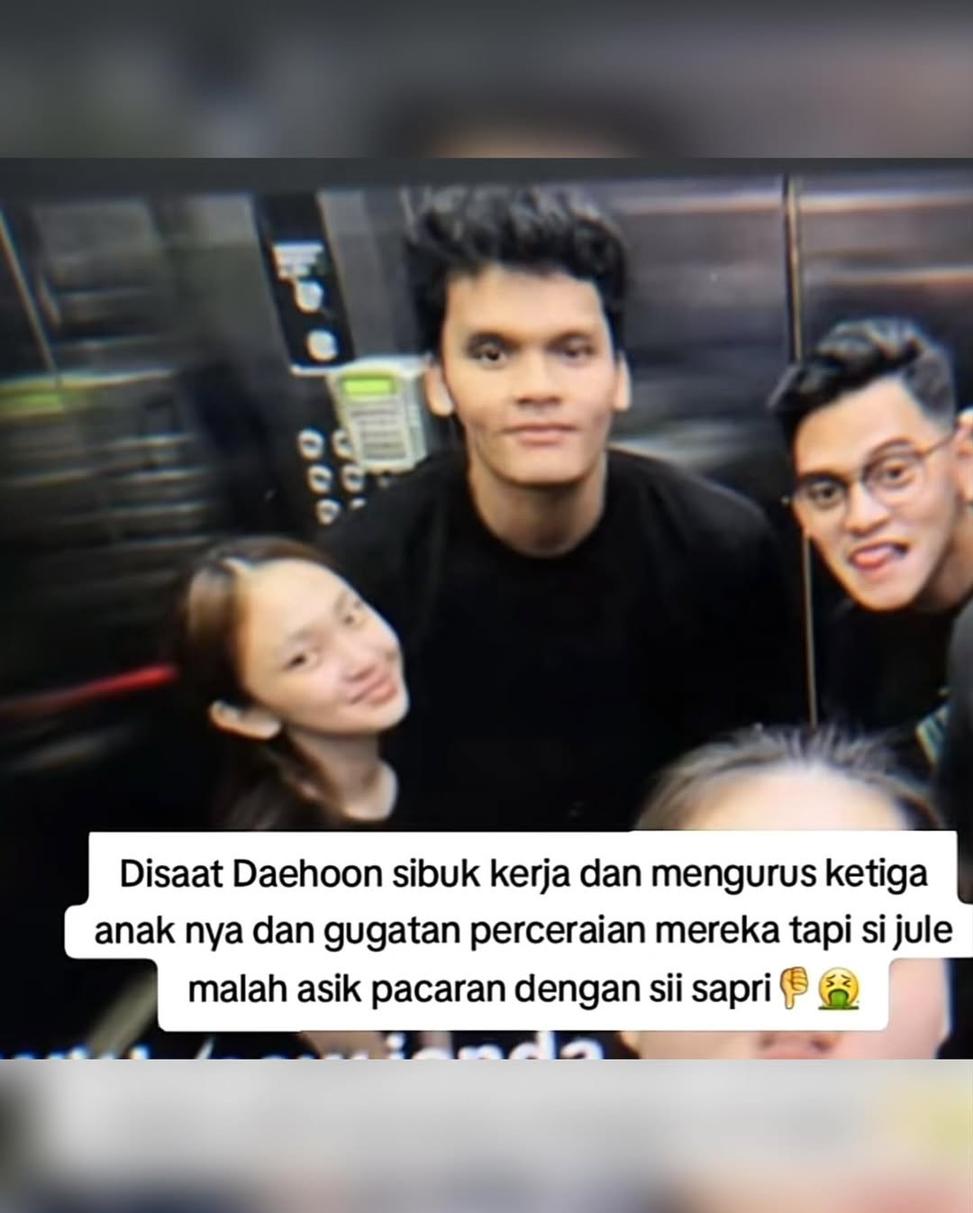Rupanya, meski rumah tangganya dengan Na Daehoon tengah berada di ujung tanduk, warganet justru dibuat heboh dengan beredarnya foto Jule dengan pria yang diduga selingkuhannya, Safrie Ramadhan. Terlihat Jule berada dalam lift bersama Safrie dan beberapa temannya.