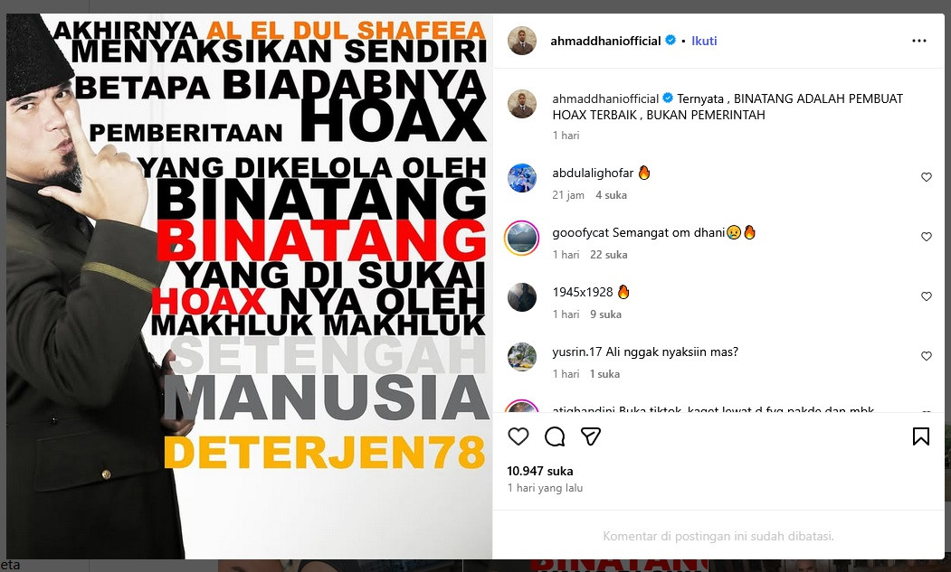 Melalui unggahan di Instagram miliknya, Ahmad Dhani pun meluapkan kekecewaannya atas pemberitaan hoax yang menyeret namanya. Dia juga menyebut bahwa berita-berita hoax itu sangat disukai oleh netizen.