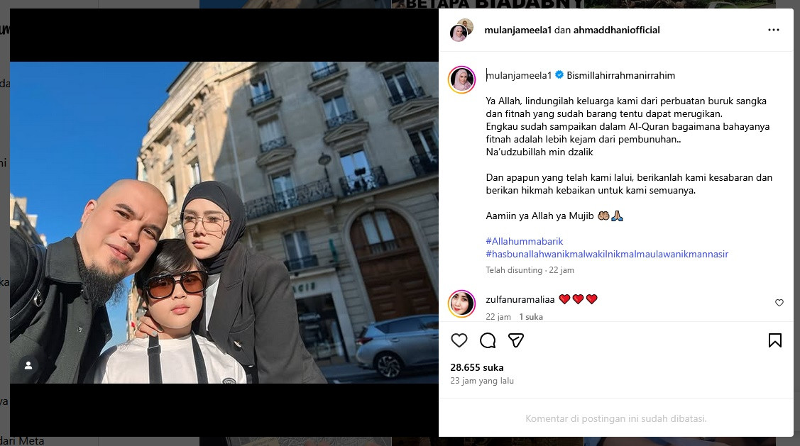 "Engkau sudah menyampaikan dalam Alquran bahwa fitnah lebih kejam dari pembunuhan. Na'udzubillah min dzalik," tulis Mulan Jameela.