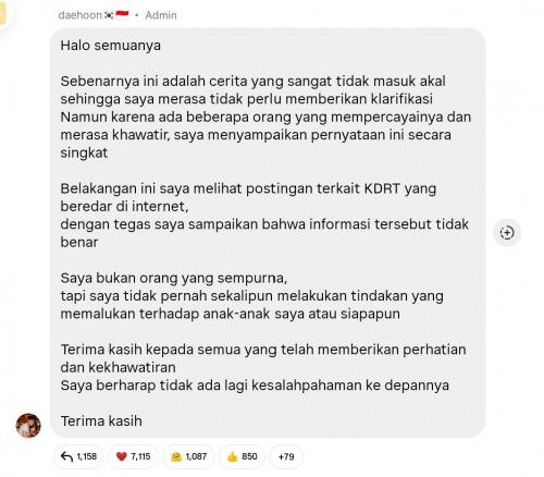 "Dengan tegas saya sampaikan bahwa informasi terkait KDRT tersebut tidak benar," Kata Na Daehoon.