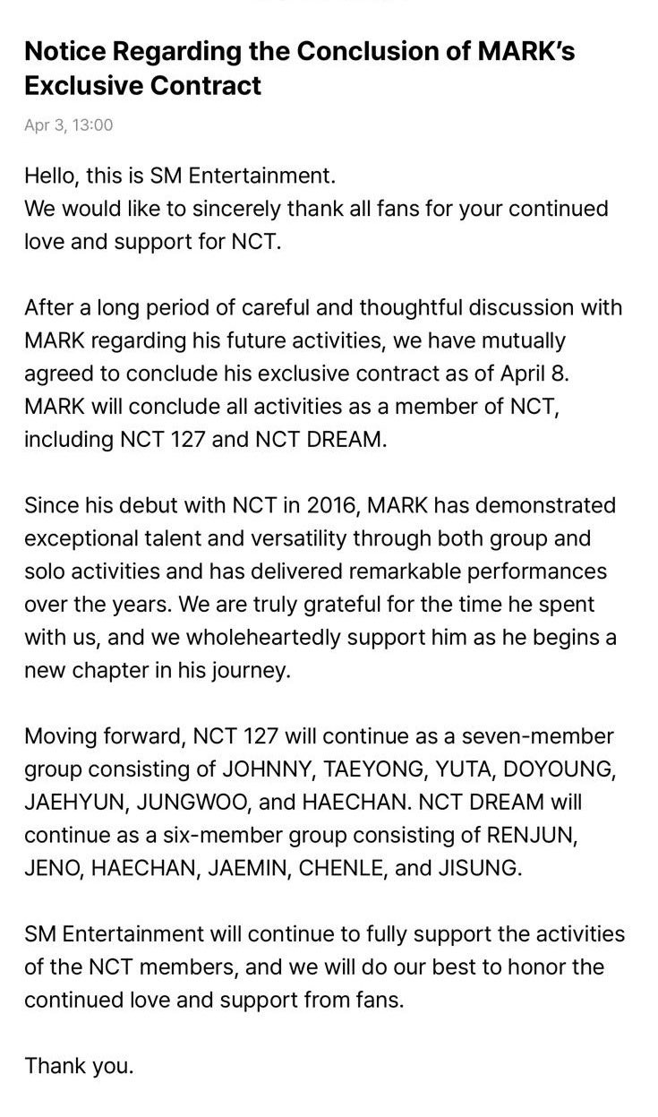 Sejak memulai debut dengan NCT di tahun 2016, Mark memang dikenal sebagai salah satu anggota yang bertalenta dan fleksibilitas tinggi, baik dalam aktivitas grup maupun solo. Oleh karena itu, pihak agensi menyampaikan rasa terima kasih atas kontribusi dan perjalanan yang telah dilalui bersama dan akan memberikan dukungan penuh untuk langkah baru penyanyi berusia 27 tahun itu ke depannya.